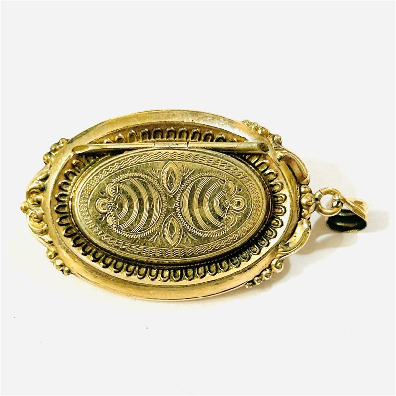 Honosný přívěšek sloužící i jako medailon na fotografie, oválně tělo bohatě plasticky tvarováno a dekorováno ve stylu pozdního biedermeieru. Frontální část v kontrastním lesklém a matovaném zlatavém odstínu, ve středu osazena v zrnité obrubě přírodním diamantem kulatého jednoduchého brusu o váze 0,03 ct, víčko při zadní straně zdobeno jemným gilošováním. Prostor pro fotografie podložen purpurem a opatřen krycími sklíčky. Kvalitní západoevropská zlatnická práce ze 3. čtvrtiny 19. století. Zhotoveno ze zlatavé slitiny stříbra o ryzosti 350/1000, rámečky z obecného kovu; neznačeno. Hmotnost 9,43 g, celková délka 50 mm, šířka 26 mm. Zavírání v pořádku, nepůvodní osazení kamene, jedno z krycích sklíček nahrazeno plastem, celkově v zachovalém stavu.