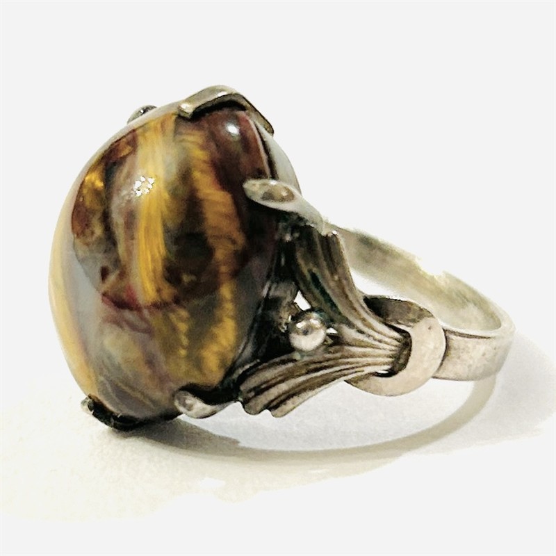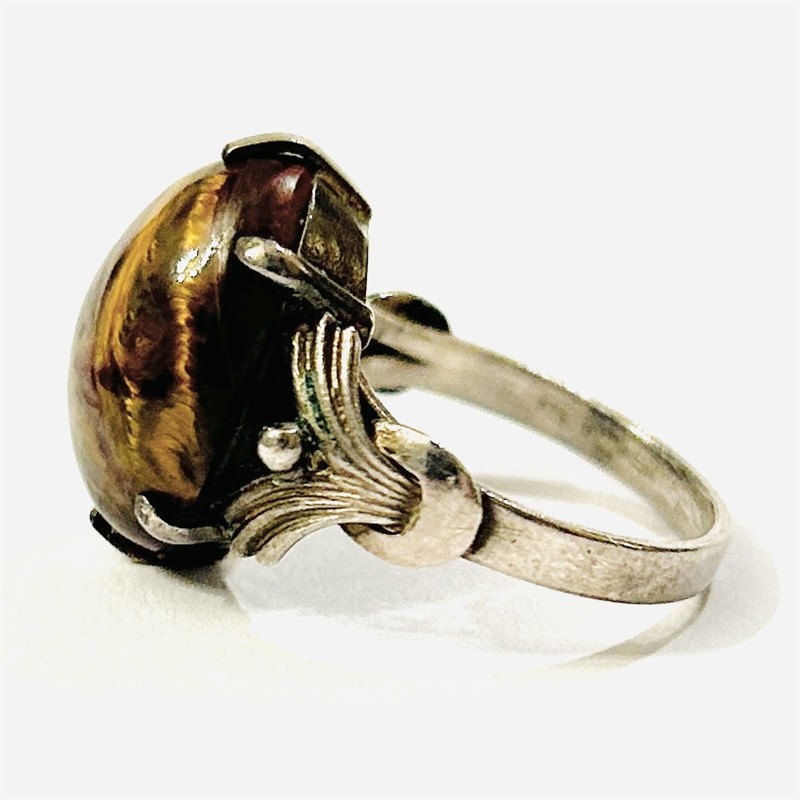 Výrazný prsten osazený zřídka se vyskytující odrůdou červeného achátu s tygřím okem, oválná mugle fasována šesti krapnami, přístavky šíny v art-de o tvarosloví. Kvalitní, patrně západoevropská zlatnická práce z druhé třetiny 20. století, dovezená na naše území ve stejném období. Zhotoveno z nezlaceného stříbra o ryzosti 925/1000; československý dovozový punc S-43 (lilie s Č), ryzostní číslo a značka zevnitř šíny. Hmotnost 4,80 g, velikost 54, délka hlavice 17,5 mm. Ponecháno s přirozenou patinou, lze vyčistit, jinak v zachovalém stavu.