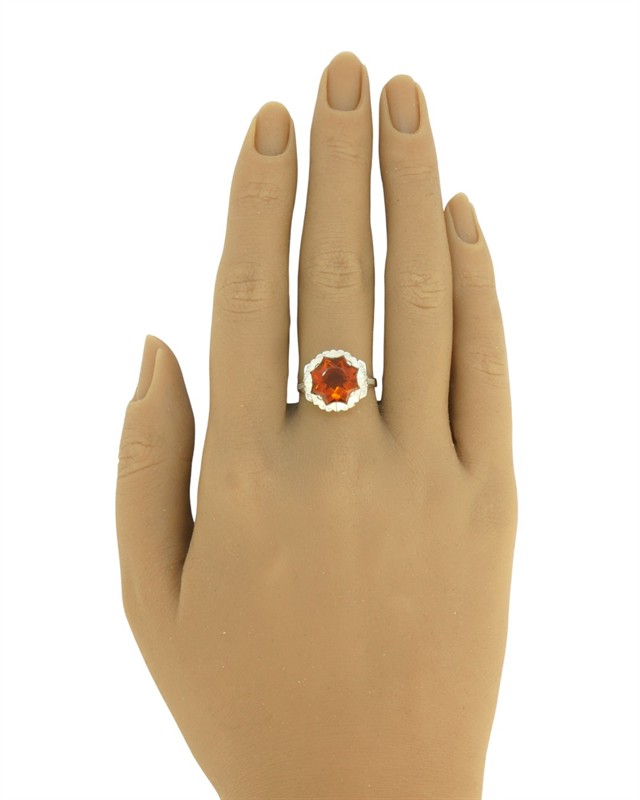 Velmi elegantní starožitný prsten z bílého zlata je osazený přírodním citrínem zářivé, hnědooranžové barvy o hmotnosti 4,3 ct, hlava prstenu kolem osazení kamene je velmi pěkně řemeslně zpracovaná, průměr je cca 1,5 cm, prsten byl vyroben ve 20.- 30. letech 20. století, v období Art Deco a je puncován puncem z období První republiky, bílé zlato o ryzosti 14 karátů 585/1000 o celkové hmotnosti 3,40 g, velikost prstenu 55.