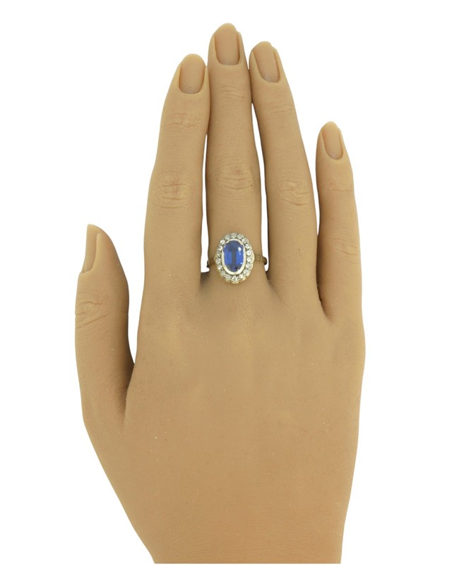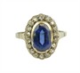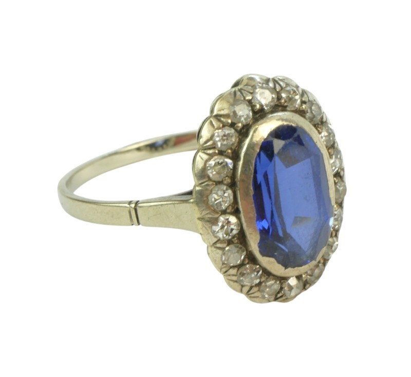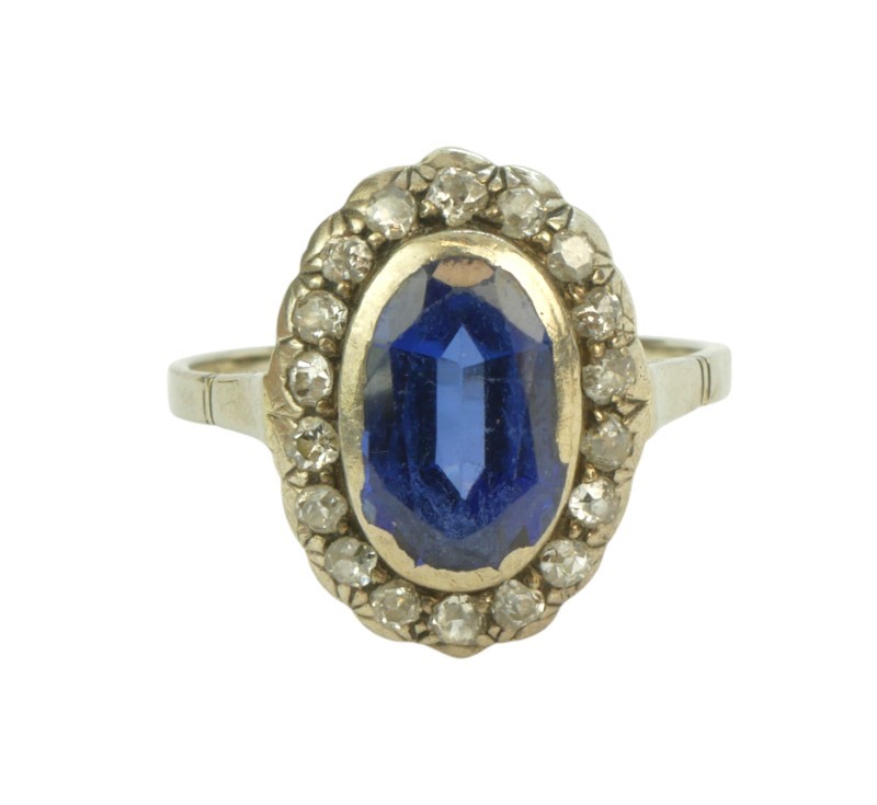 Starožitný zlatý prsten s přírodními diamanty 0,40 Ct a syntetickým safírem, zlato o ryzosti 585/1000 o celkové hmotnosti 3,05 g, Atest puncovního úřadu, velikost prstenu 59, rozměry hlavy prstenu 1,8 x 1,1 cm.
