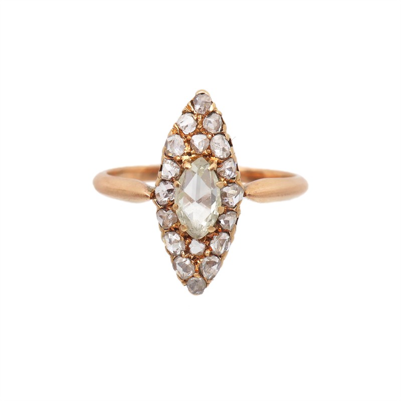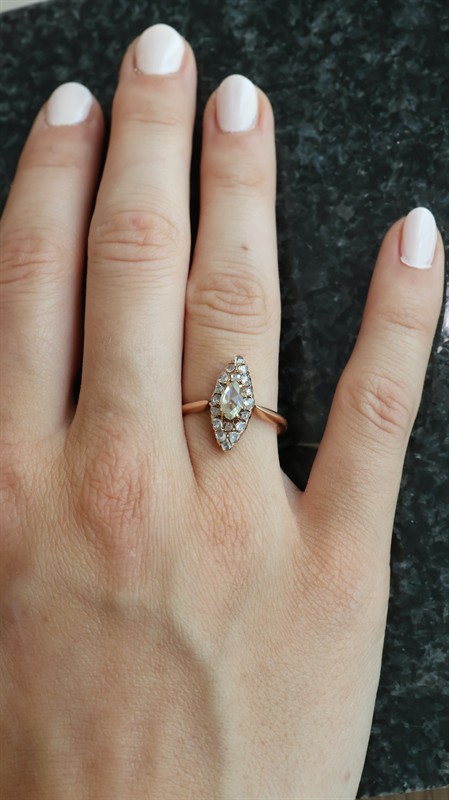 Zlatý prsten, 585/1000, celková hmotnost 2,54 g | Přírodní diamanty | Rakousko Uherská práce | Rok 1880 | Velikost prstenu 53 | Velikost hlavy 1,9 x 0,7 cm | Výborný stav | Kameny zkontrolovány v gemologické laboratoři