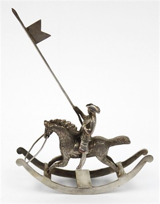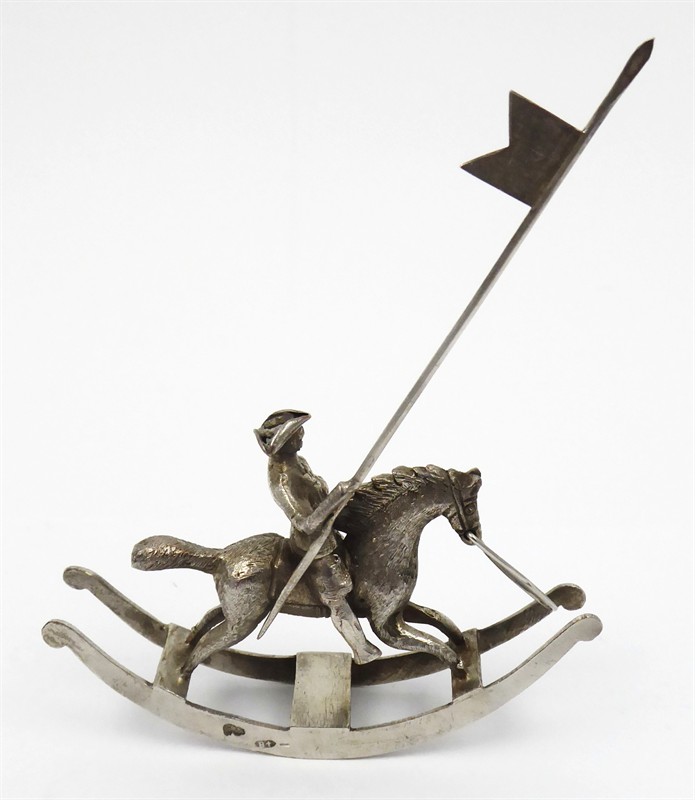 Postříbřená měď a mosaz. Pravděpodobný výrobce: Firma Gebrüder Dingeldein založená roku 1868 v německém Hanau. Figura jezdce na koni z postříbřené mědi a mosazi umístěná na stylizované kolébce. Jezdec drží v pravé ruce praporec. Značeno: nezřetelné značky na boku ohlávky. Německo, Hanau ?, minulé století. Výška s praporcem 9 cm, šířka 7 cm.