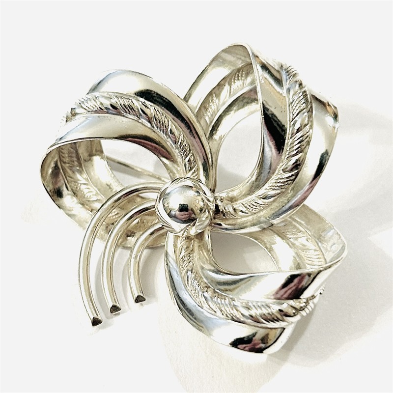 Elegantní, větší brož ve tvaru stylizované mašle, ladně tvarované křivky se středovým plastickým pásem, uprostřed doplněno kuličkou. Originální práce, patrně z 2. poloviny 30. let 20. století, dle značení jabloneckého klenotníka Bruno Czorcha. Zhotoveno z nezlaceného stříbra o ryzosti 900/1000; prvorepublikový punc S-46 (slovenské trojvrší 3), ryzostní číslo a "BC" zezadu. Hmotnost 12,22 g, délka 43,5 mm, šířka 42,5 mm. Zapínání na "C" sponu v pořádku, ve velmi zachovalém stavu, odborně vyčištěno a vyleštěno zlatníkem.