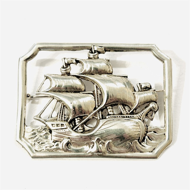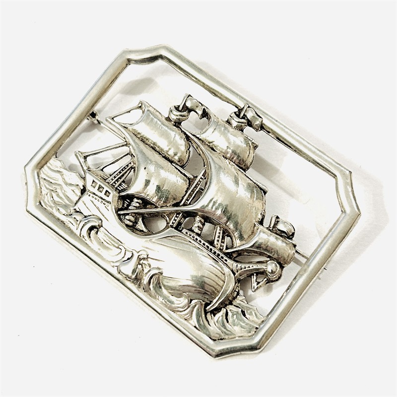 Výrazná obdélná brož z období art-deco s výjevem stylizované historické plachetnice na rozvlněném moři. Plasticky provedeno s četnými průhledy. Tematický šperk s v minulosti oblíbeným námětem, tuzemská zlatnická práce z let 1941-1945. Vyrobeno technikou perforovaného plechu. Zhotoveno z nezlaceného stříbra o ryzosti 800/1000; protektorátní punc S-53 (šachovnice 5) zezadu. Hmotnost 12,60 g, délka 60 mm, šířka 45 mm. Zapínání na "C" sponu v pořádku, celkově v zachovalém stavu, odborně vyčištěno a vyleštěno zlatníkem.