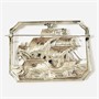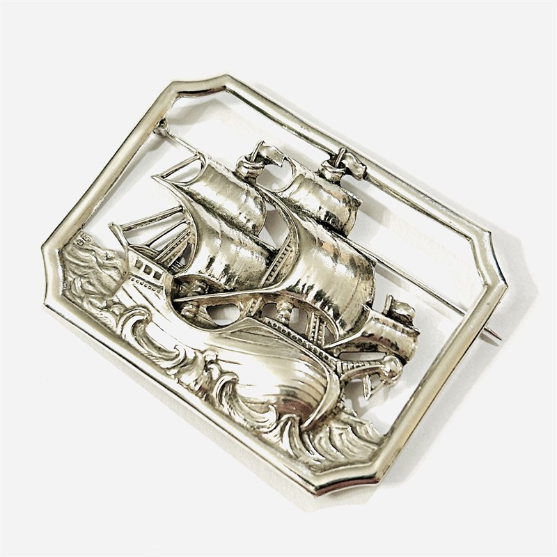 Výrazná obdélná brož z období art-deco s výjevem stylizované historické plachetnice na rozvlněném moři. Plasticky provedeno s četnými průhledy. Tematický šperk s historicky oblíbeným námětem, práce pražského klenotníka Antonína Novotného z let 1941-1945. Vyrobeno technikou perforovaného plechu. Zhotoveno z nezlaceného stříbra o ryzosti 800/1000; protektorátní punc S-53 (šachovnice 5), ryzostní číslo a mistrovská značka "AN" zepředu a na jehle. Hmotnost 11,91 g, délka 60 mm, šířka 45,5 mm. Zapínání na "C" sponu v pořádku, celkově ve velmi zachovalém stavu, odborně vyčištěno a vyleštěno zlatníkem.