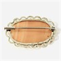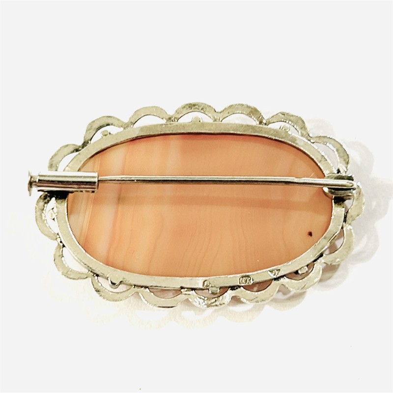 Elegantní brož z období pozdního art-deco, osazeno přírodním českým achátem výjimečného pleťového zbarvení, který je oválného zaobleného plochého brusu a fasovaný několika krapnami, minimalistický rámeček s prořezávanými obloučky. Designem nadčasový, kvalitně zpracovaný šperk z dílny z pražského klenotníka Ladislava Neumanna z let 1941-1944. Zhotoveno z nezlaceného stříbra o ryzosti 835/1000; protektorátní punc S-52 (šachovnice 4), ryzostní číslo a mistrovská značka "LN" zezadu a na jehle. Hmotnost 7,77 g, délka 40,5 mm, šířka 26 mm. Zapínání v pořádku, trombónová pojistka volnější (při nošení drží lépe), celkově ve velmi zachovalém stavu, odborně vyčištěno a vyleštěno zlatníkem.