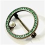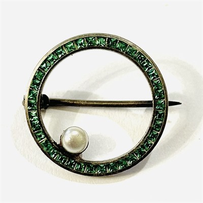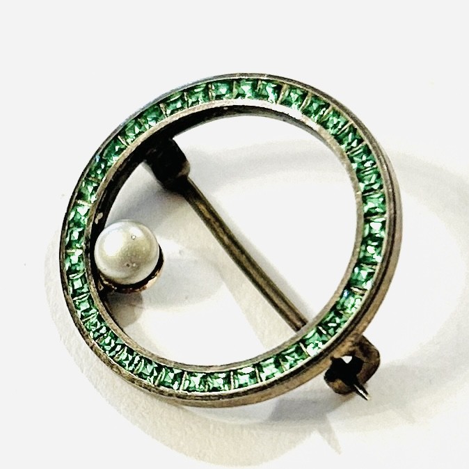 Půvabná menší kruhová brož z období art-deco, rám osazen zářivými zelenými kameny čtvercového brusu, při vnitřní hraně doplněno bílo-šedou umělou voskovanou perlou. Nadčasový design, patrně německá zlatnická práce z 20. až 30. let 20. století. Zhotoveno z nezlaceného stříbra o ryzosti 800/1000; ryzostní číslo a značka výrobce "WP" zezadu. Hmotnost 2,16 g, průměr 19,5 mm. Zapínání na "C" sponu v pořádku, ponecháno s přirozenou patinou, celkově ve velmi zachovalém stavu.