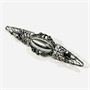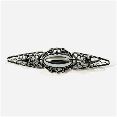 Dekorativní podlouhlá brož osazena oválnou muglí přírodního hematitu, spletité tělo s organicky vinutými křivkami. Historizující vyznění šperku podtrhává umělá patina. Polská autorská práce z konce 20. či počátku 21. století. Zhotoveno z nezlaceného patinovaného stříbra o ryzosti 925/1000; polský punc a mistrovská značka na jehle. Hmotnost 6,73 g, délka 68 mm, šířka 17,5 mm. Zapínání včetně pojistky v pořádku, celkově ve velmi zachovalém stavu.