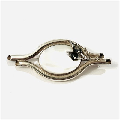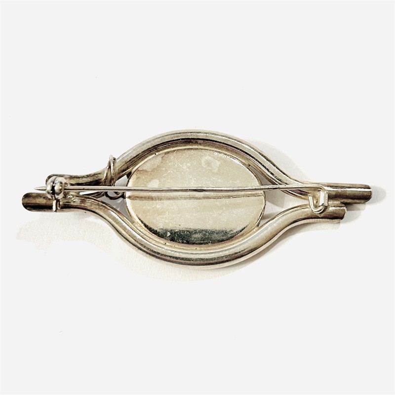 Půvabná brož, jíž vévodí oválná plochý perleťový kámen, tělo tvořeno tvarovanými trubičkami, ozdobeno uměle patinovanými listy se splétanými stonky doplněnými granulovanými kuličkami. Polská autorská práce z konce 20. či počátku 21. století. Zhotoveno z nezlaceného stříbra o ryzosti 925/1000; polský punc a značka výrobce na jehle. Hmotnost 9,69 g, délka 62 mm, šířka 25,5 mm. Zapínání včetně pojistky v pořádku, ponecháno s jemnou přirozenou patinou, lze vyčistit, celkově ve velmi zachovalém stavu.