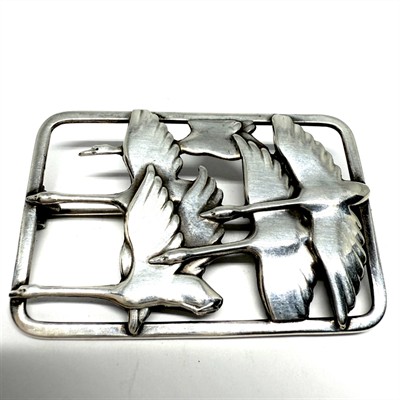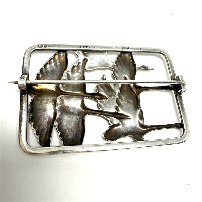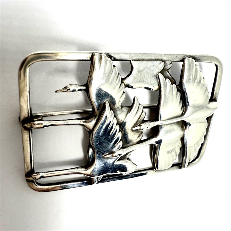 Půvabná, celostříbrná brož s motivem plasticky ztvárněných letících labutí. Šperk byl zhotoven v první polovině 20.století, ze stříbra ryzosti 830/1000. Celková váha 10,68 g. Rozměry cca 5 x 3,5 cm. Autorská, ryzostní a puncovní značka. Perfektní, sbírkový stav.