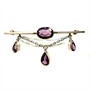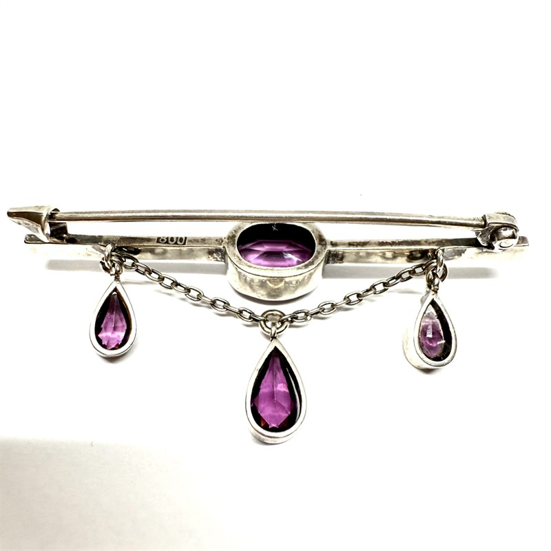 Jemná, velmi půvabná stříbrná brož. Šperk byl zhotoven počátkem 20.století v secesním duchu a zdobí jej fazetově vybroušené ametysty sytého odstínu. Stříbro ryzosti 800/1000, celková váha 3,23 g. Rozměry 4,5 x 2 cm. Výborný stav.