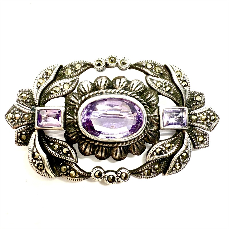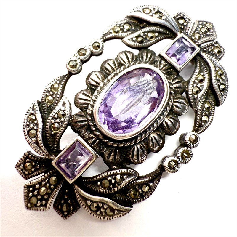 Stříbrná brož s ametysty a markazity