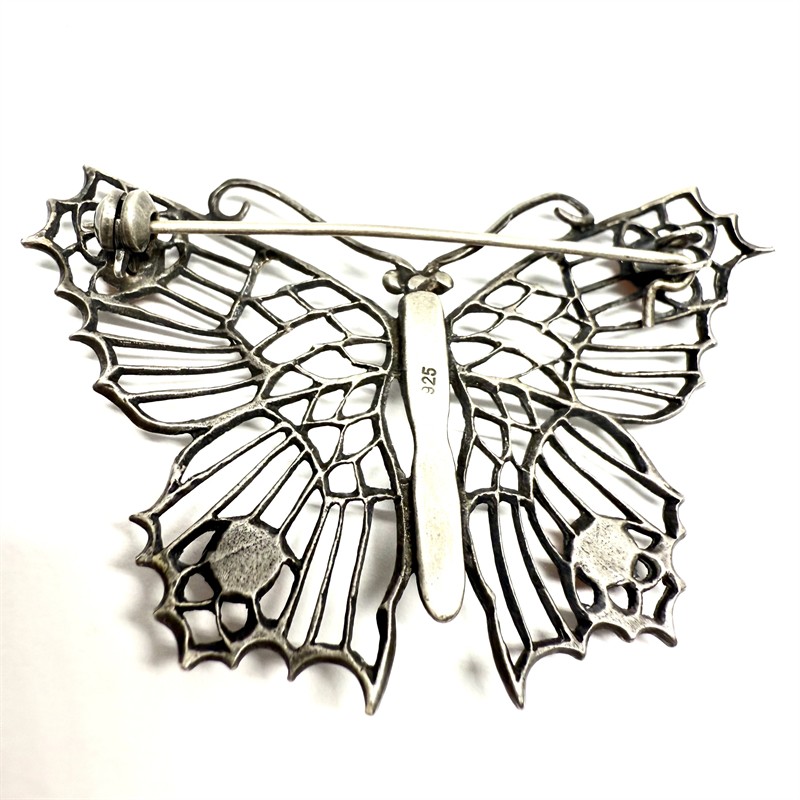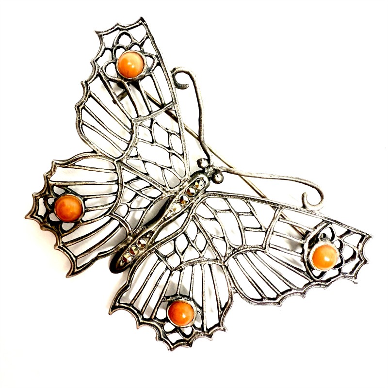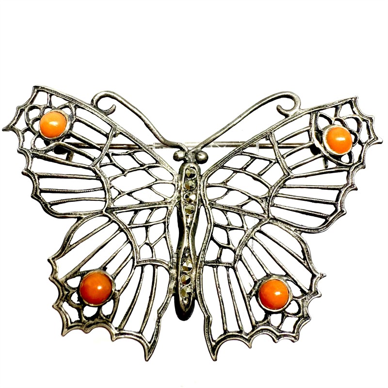 Stříbrná brož s korály a markazity - motýl