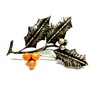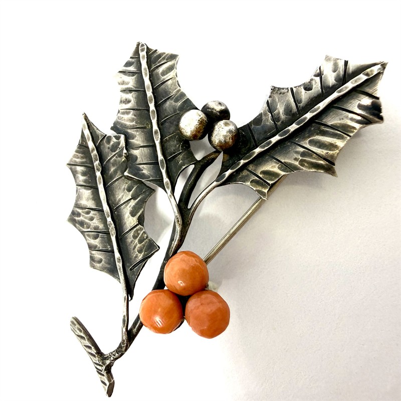 Originální, velmi půvabná stříbrná brož - větévka cesmíny. Brož byla zhotovena ze stříbra sterlingové ryzosti (925/1000). Jehla obecný kov. Celková váha 6,91 g. Šperk mimo nevšední formy samotné zdobí tři korály sytého lososovitého odstínu. Rozměry cca 5 x 3 cm. Výborný stav.