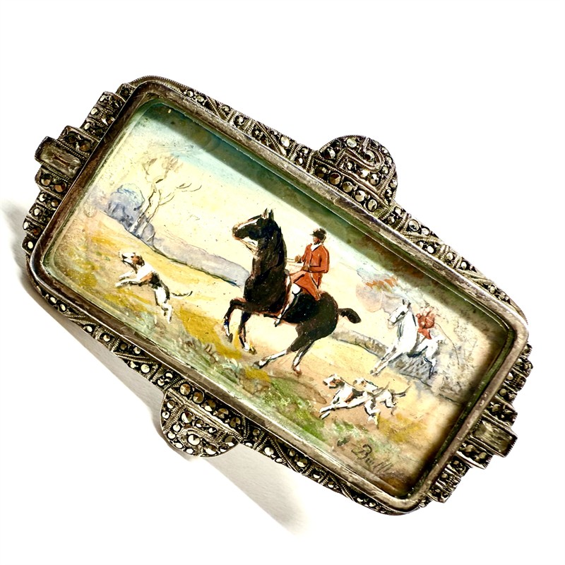 Malebná stříbrná brož nesoucí ručně malovanou kresbu s loveckým motivem můžů na koních a psů. Výjev je zarámován elegantně se třpytícími markazity. Šperk byl vyroben ze sterlingového stříbra (925/1000) v první polovině 20.století. Váha 19,66 g. Rozměry 5,5 x 3,5 cm. Osvědčení Puncovního úřadu. Výborný stav.