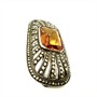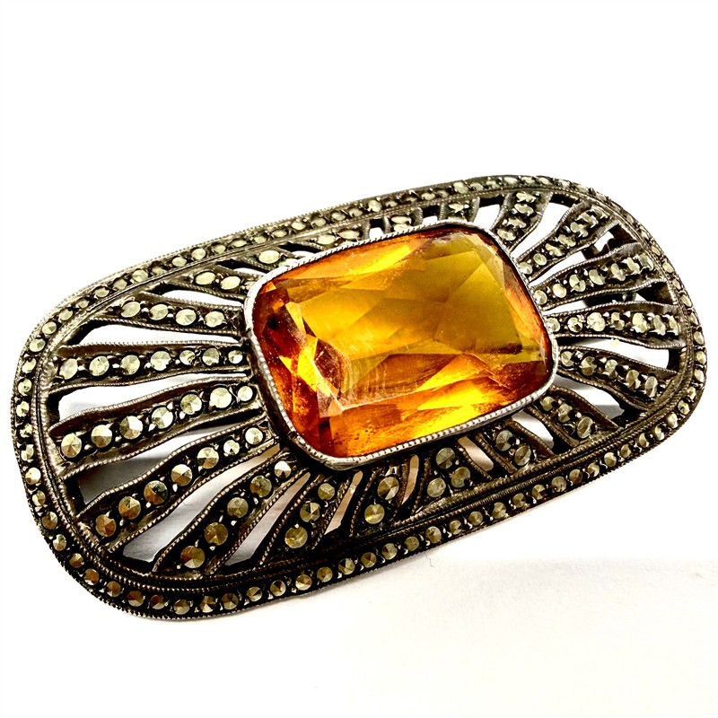 Elegantní, stříbrná brož zhotovena v první polovině 20.století ve stylu Art deco. Šperk zdobí centrální kámen koňakové barvy, fazetového brusu, kontrastně dozdobený elegantními markazity. Stříbro ryzosti 835/1000, celková váha 10,22 g. Rozměry 4,5 x 2,3cm. Šperk je v původním stavu s půvabnou patinou a je v perfektním stavu.