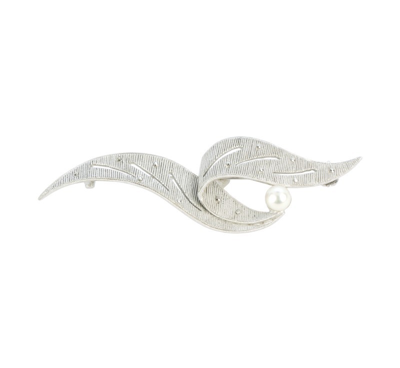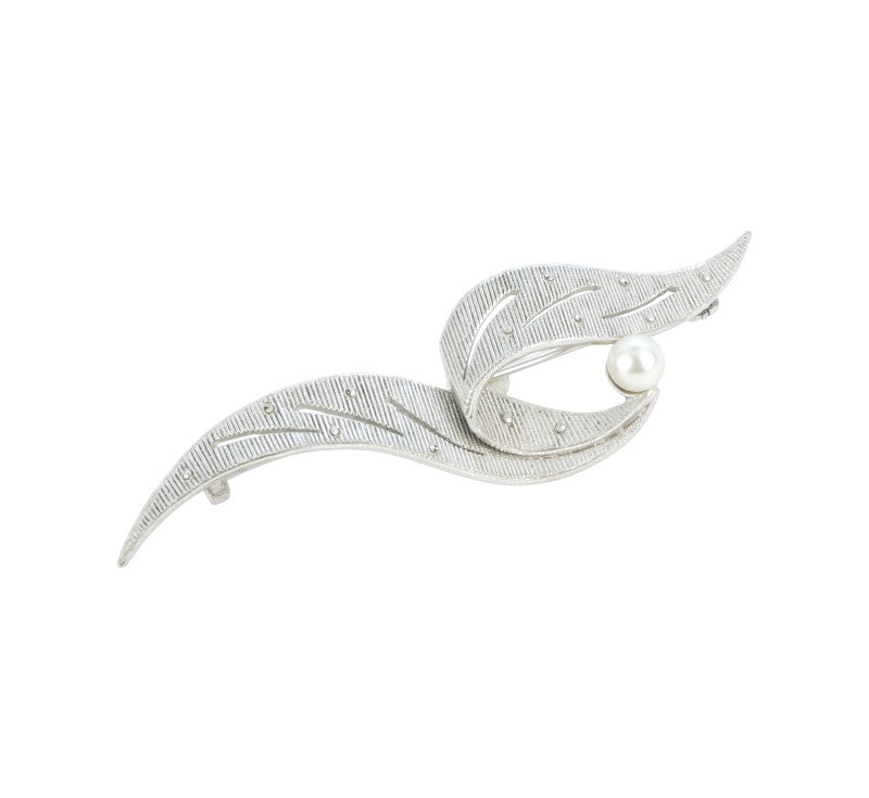 Brož vyrobená ze stříbra ryzosti 925/1000 zdobená markazity a perlou z dílny věhlasného šperkaře Theodora Fahrnera. Rozměry 1,6 x 7,2 cm. Celková hmotnost 7,62 g.