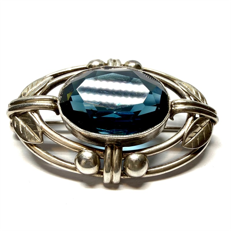Elegantní, stříbrná brož osazená fazetově broušeným kamenem, výrazné petrolejově modré barvy. Brož byla zhotovena v první polovině 20.století ze stříbra ryzosti 835/1000, o celkové váze 11,52 g. Rozměry cca 4 x 2,5 cm. Značeno. Perfektní stav.