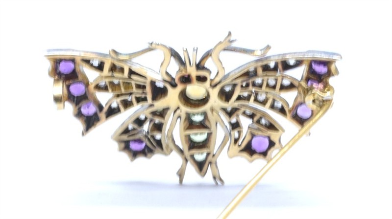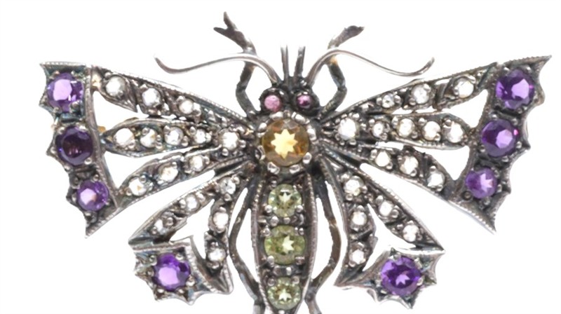 Stříbrná brož s přírodními kameny a diamanty. Stříbro 925/1000, jehla obecný kov. Přírodní citrín 0,18 ct. Přírodní peridoty, celková váha 0,26 ct. Přírodní ametysty, celková váha 0,8 ct. Přírodní diamanty - routy, kvalita SI1 - I1, barva I - J, celková váha 0,45 ct. Váha brože: 6,67 g. Velikost brože: 4 cm x 2,6 cm. Osvědčení puncovního úřadu.