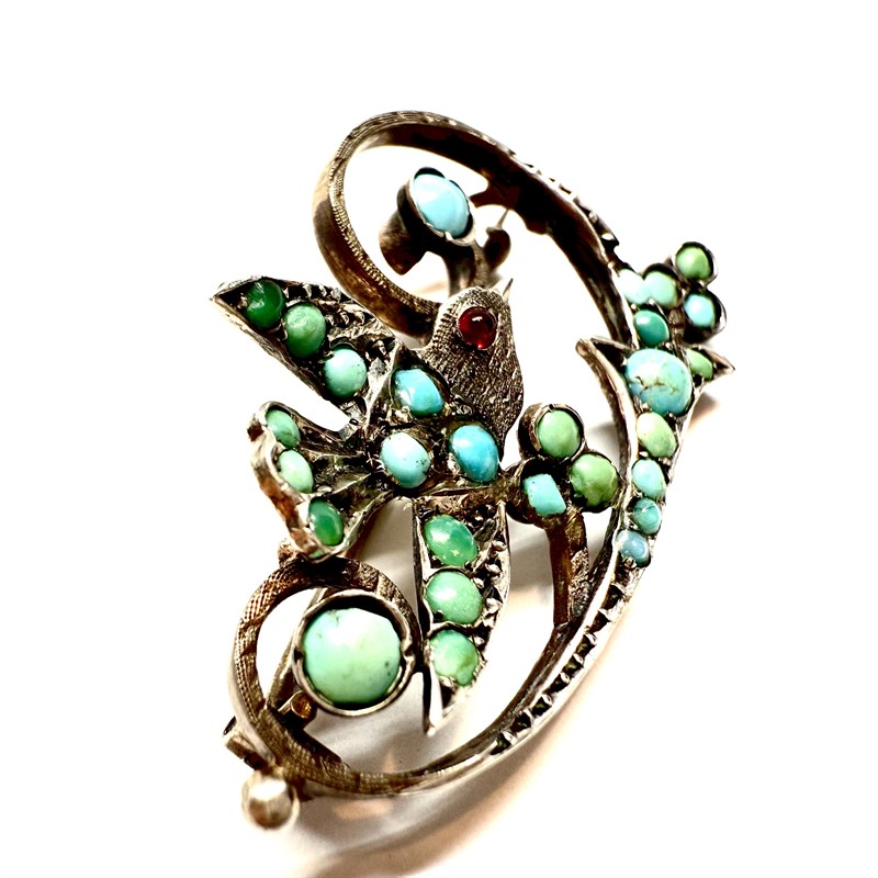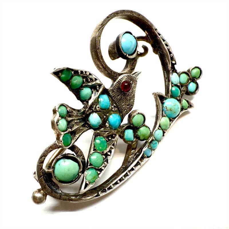 Malebná, velmi stará brož s motivem vlaštovky. Šperk zdobí tyrkysy zelenomodrých odstínu. Drahé kameny jsou přírodního původu, proto jsou jejich odstíny různé. Brož byla vyrobena koncem 19.století ze stříbra různých ryzosti 580/1000 - 890/1000. Rozměry cca 3 x 2 cm. Výborný stav.