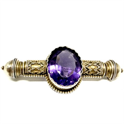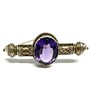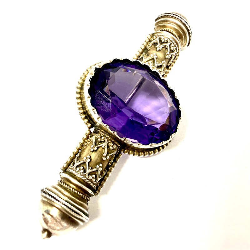 Elegantní, velmi stará, stříbrná brož. Šperku dominuje výrazně sytě fialový ametyst oválného tvaru zasazený do cargle. Stříbrná část zdobena jemným, intenzivním cizelováním. Šperk byl vyroben ze stříbra ryzosti 800/1000 v druhé polovině 19.století. Celková váha 8,15 g. Délka 5,5 cm. Výborný stav.