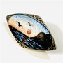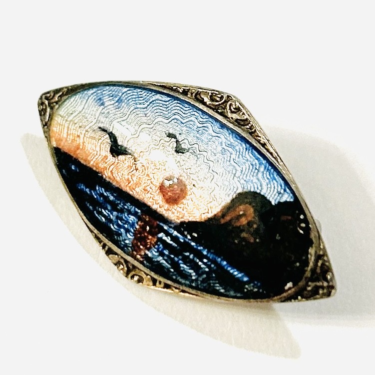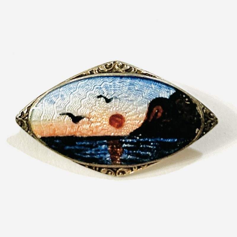 Drobnější, nevšední brož s typickým výjevem pobřeží při západu Slunce s letícími ptáky, ručně malováno ve smaltu efektně využívajícího podkladového gravírování. Zašpičatělé výběžky dekorativně plasticky vyvedeny. Precizní práce z dílny významného norského (Oslo) zlatníka Olava Fritjofa Hjortdahla (1887–1954) z 2. třetiny 20. století. Sběratelsky zajímavé. Zhotoveno z nezlaceného stříbra o ryzosti 925/1000, jehla z obecného kovu; vyhotoveno osvědčení puncovního úřadu, ryzostní číslo a značka výrobce zezadu. Hmotnost 3,30 g, délka 28 mm, šířka 16 mm. Zapínání na "C" sponu v pořádku, ponecháno s přirozenou patinou, lze vyčistit, celkově ve velmi zachovalém stavu.