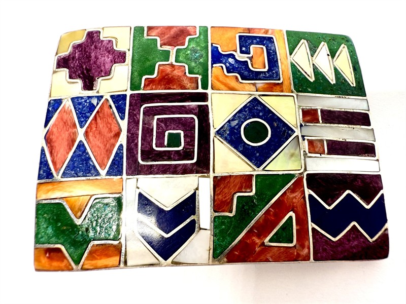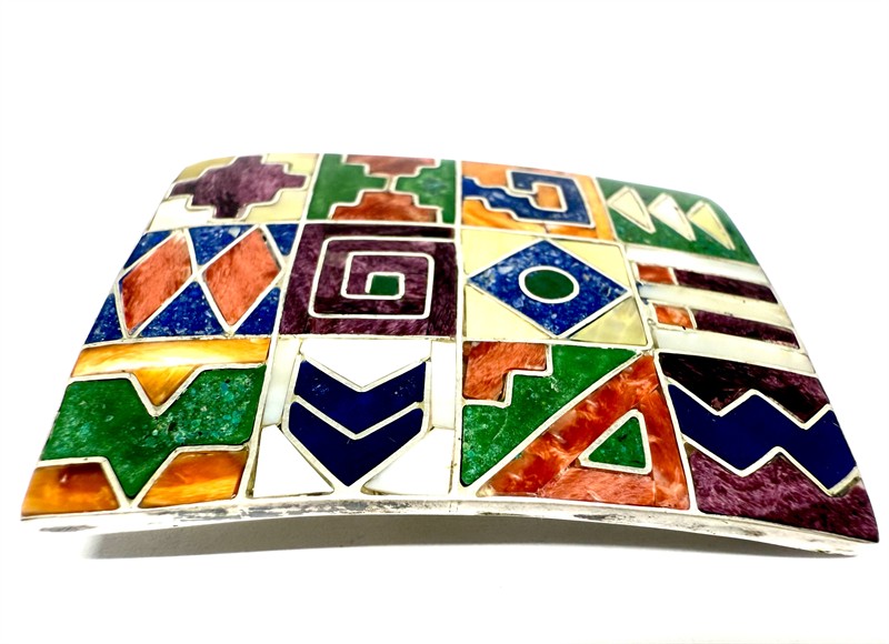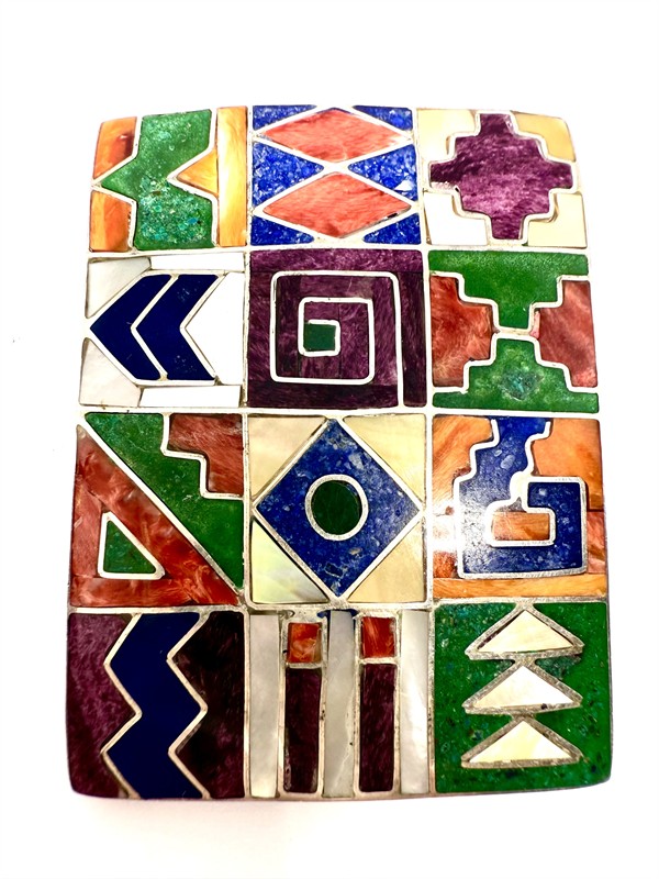 Výrazná brož jež může být po zavěšení na řetízek užívána i jako závěs. Šperk byl zhotoven z téměř ryzího stříbra (950/1000), o celkové váze 19,44 g. Zdobeno celoplošnou mozaikou z perleti a drahých kamenů. Rozměry 5 x 3,5 cm. Výborný stav. Řetízek není součástí prodeje.