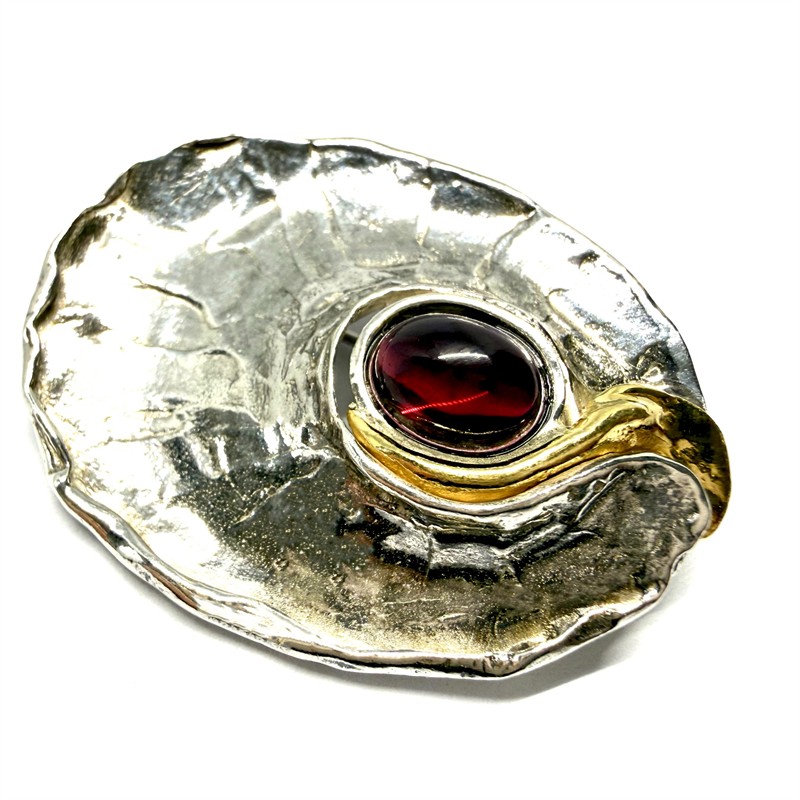 Originální, autorská brož. Šperk byl vyroben ze stříbra ryzosti 835/1000 v kombinaci se zlatou ozdobou, která je unikátně vyrobena z ryzího zlata. Šperku vévodí větší almandin hladkého brusu kabošon. Celková váha 17,95 g. Rozměry cca 4,5 x 3 cm. Signováno. Perfektní stav.