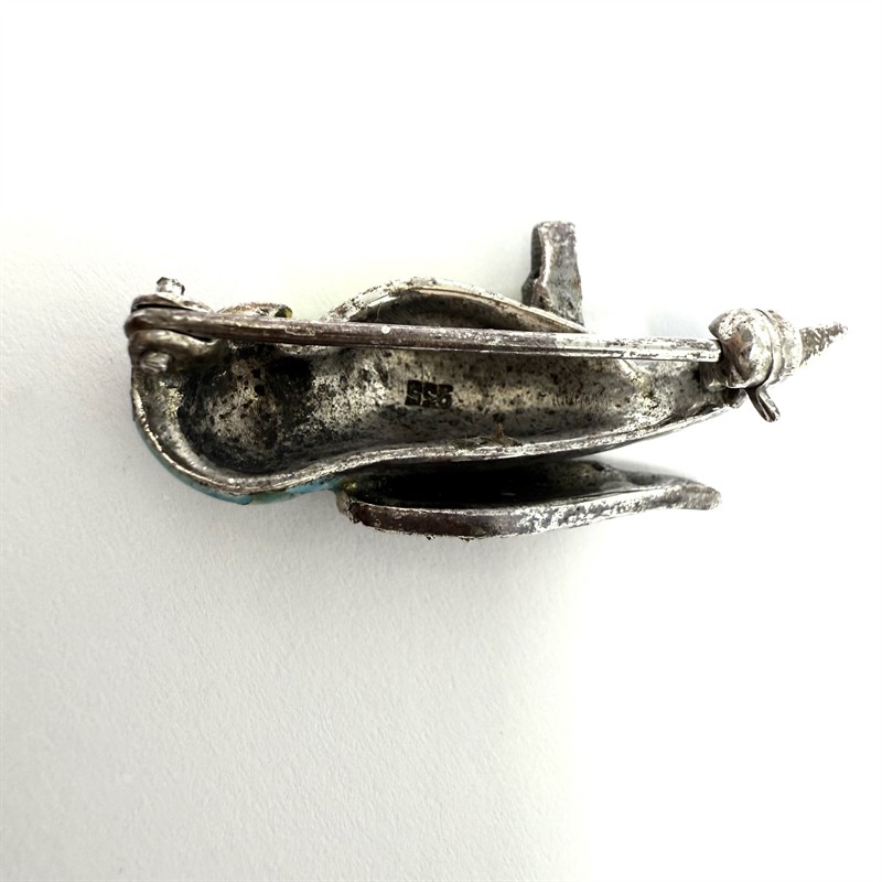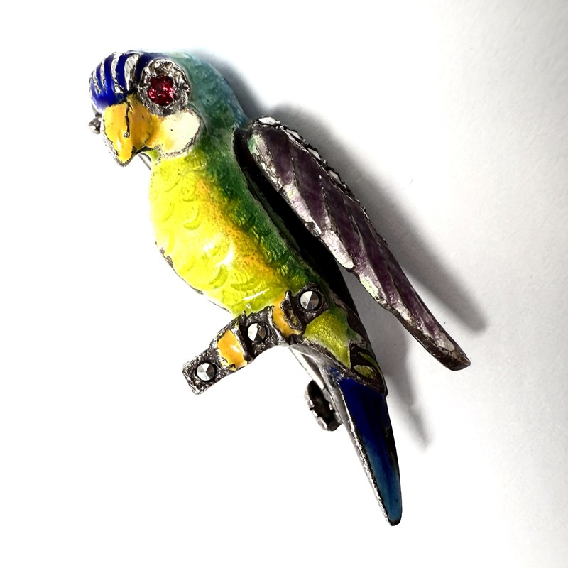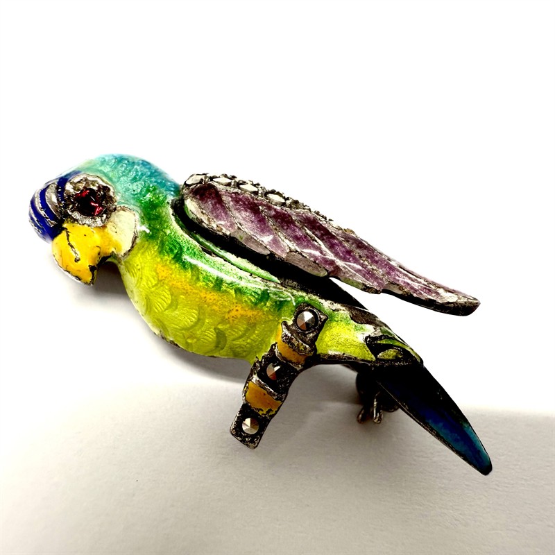 Stříbrná brož zdobená smalty a markazity - papoušek