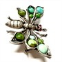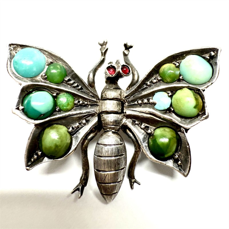 Půvabná, velmi stará, výrazná brož - motýl. Šperk zdobí přírodní tyrkysy v místě křídel a dva drobné almandiny na místě očí. Šperk byl zhotoven ze stříbra ryzosti 800/1000, o celkové váze 7,30 g. Jehla z obecného kovu. K broži je vyhotoveno osvědčení Puncovního úřadu. Rozměry 3,5 x 2,5 cm. Výborný stav.