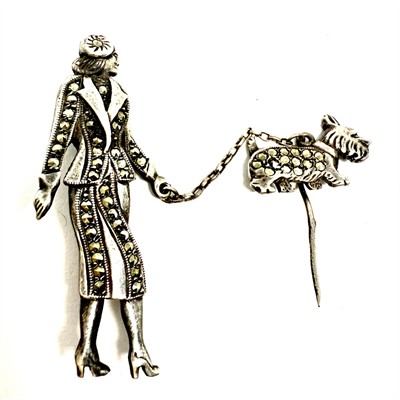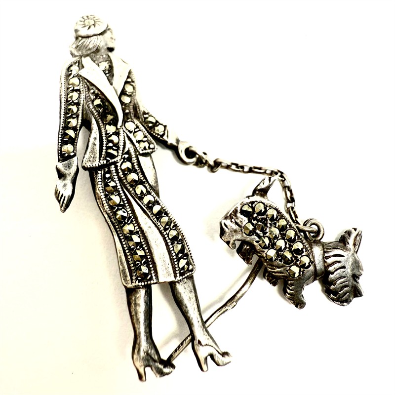 Raritní stříbrná dvoubrož dáma s psíkem zhotovená v první polovině 20.století ve stylu Art deco. Šperk je vyroben ze sterlingového stříbra (925/1000), jehla obecný kov. Zdobí jej velké množství elegantně se třpytících markazitů. Celková váha 7,74 g. Výška ženy cca 5 cm. Perfektní, sbírkový stav.