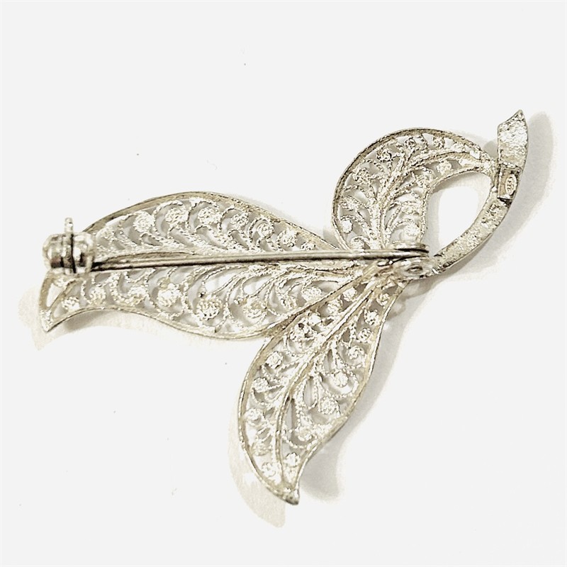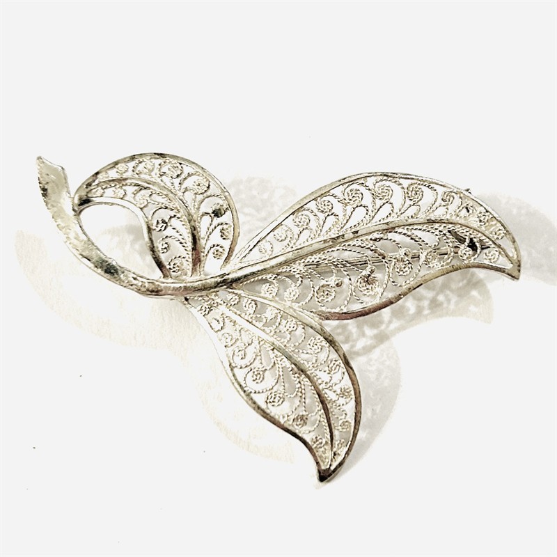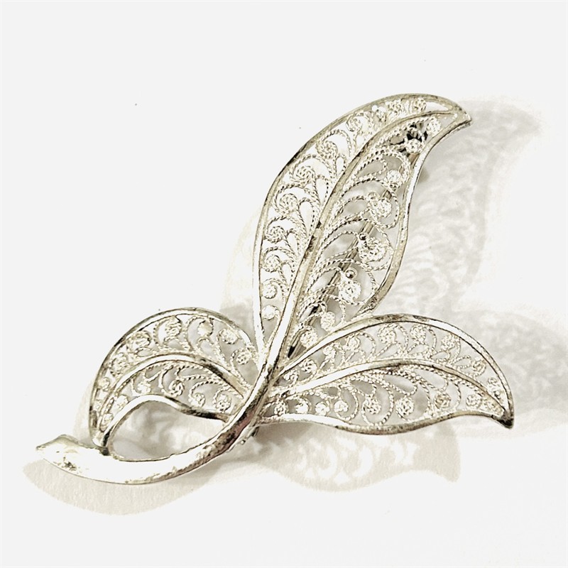 Elegantní brož ve tvaru tří vinutých listů, jež jsou vyplněny jemnými filigránovými volutami. Patrně německá zlatnická práce ze 3. čtvrtiny 20. století. Zhotoveno z nezlaceného stříbra o ryzosti 835/1000; nově opatřeno puncem S-68 (zajíc 4) na jehle, ryzostní čísla zezadu. Hmotnost 3,72 g, délka 46,5 mm, šířka 40 mm. Zapínání včetně pojistky v pořádku, ponecháno s lehkou přirozenou patinou, lze vyčistit, celkově v zachovalém stavu.