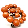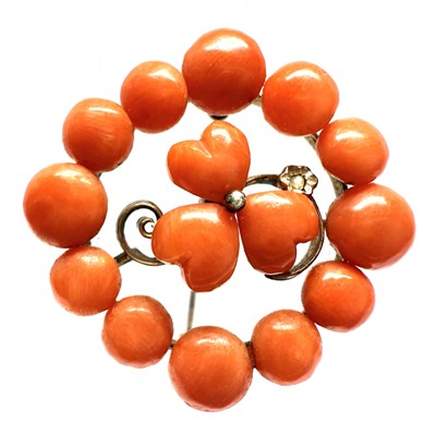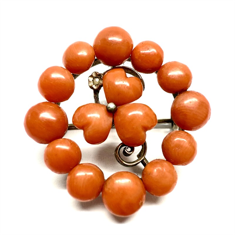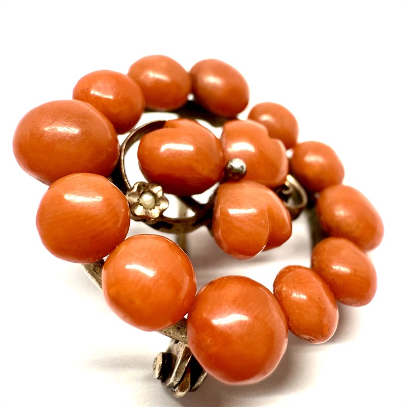 Malebná, velmi stará stříbrná brož. Šperk zdobí velké mořské korály sytého korálového odstínu. Stříbro ryzosti 800/1000. Celková váha šperku 4,81 g. Průměr 2,7 cm. Výborný stav.