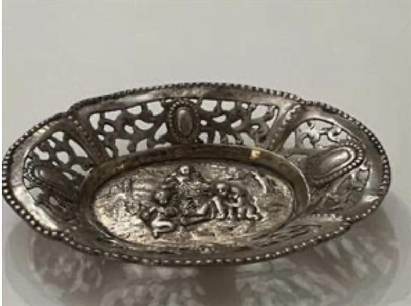 Stříbrná roztomilá mistička, 800/1000, značeno Diana,hmotnost 37 gramů,neorenesance. oválná mistička se zdobeným vyřezávaným okrajem,,zdobená reliéfním ornamentem s granulací., Výjev andělíčku, Velikost 10 na 7 cm