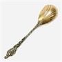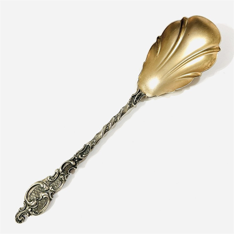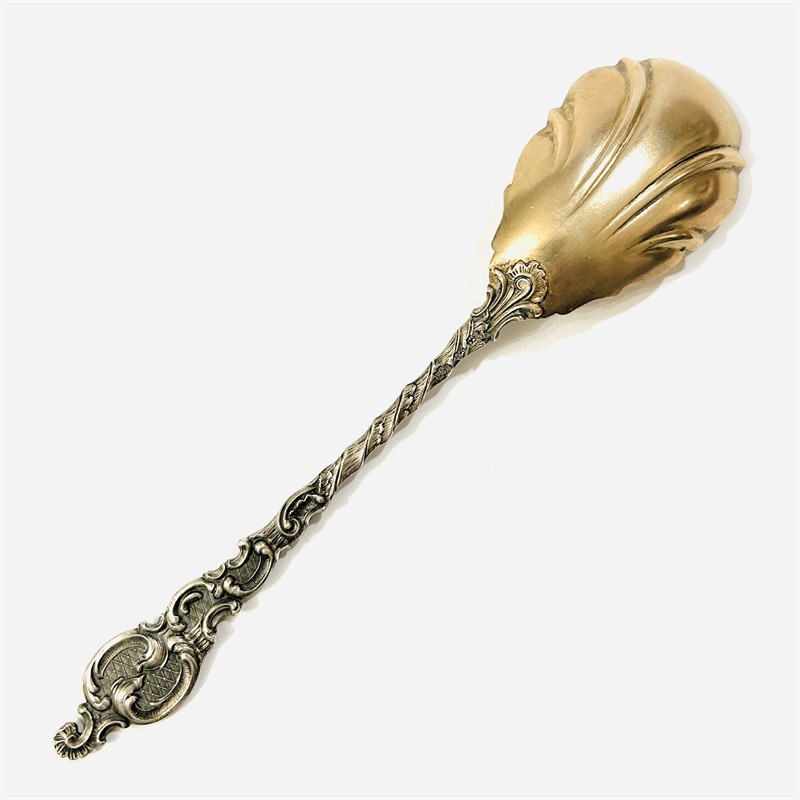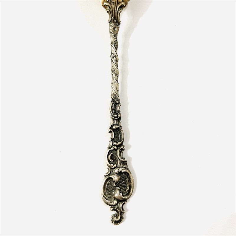 Dekorativní servírovací lžíce, miska ve tvaru lastury kontrastně matně zlacena, střenka s oboustranně plasticky vyvedena s výrazným rokajovým tvaroslovím. Honosný kousek stolního stříbra, mistrovská stříbrnická práce, možná z dílny Wilhelma Bindera ze Schwäbisch Gmünd z poslední pětiny 19. století. Zhotoveno ze stříbra o ryzosti 800/1000; vyhotoveno osvědčení puncovního úřadu, německý punc "srpek měsíce s korunou", ryzostní číslo a značka výrobce zespoda střenky. Hmotnost 32,12 g, délka 18,6 cm, šířka 4,2 cm. Ponecháno s přirozenou patinou, lze vyčistit, jinak v zachovalém stavu.