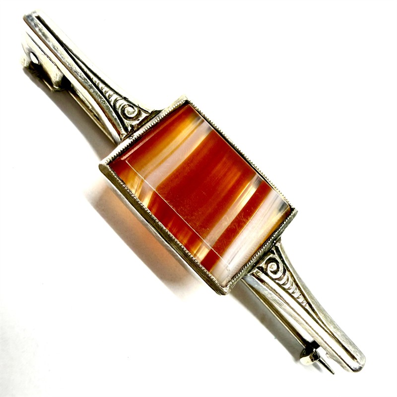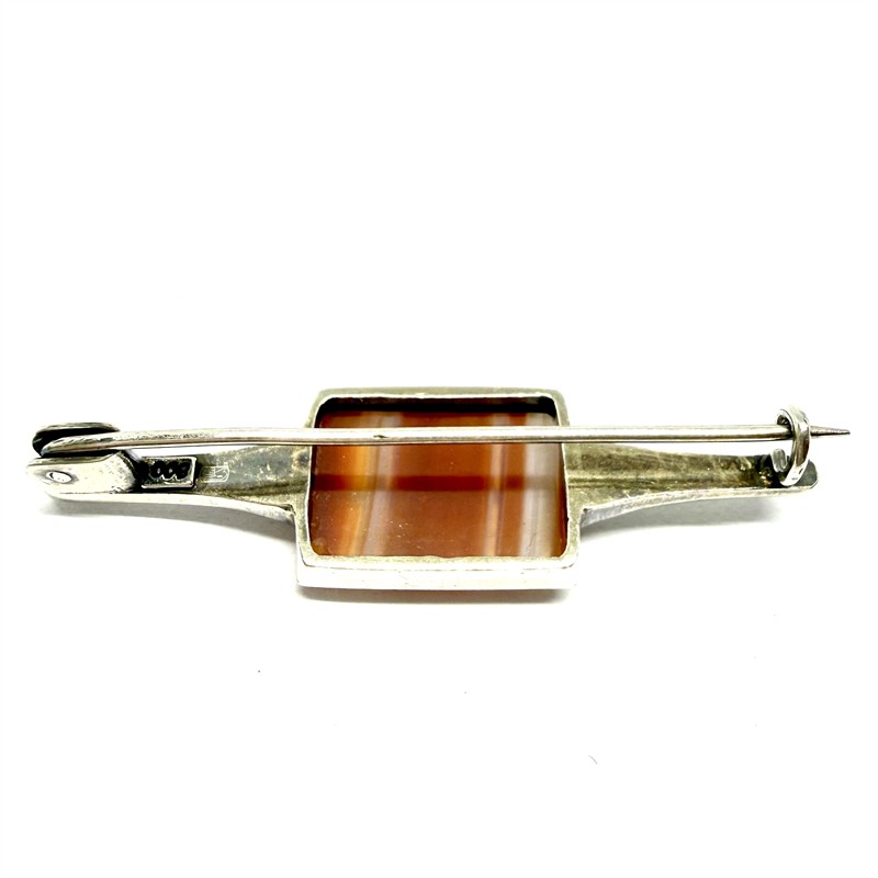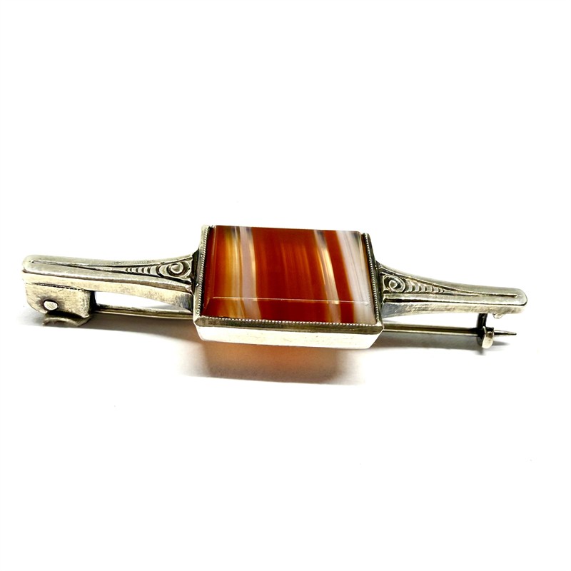 Decentní, drobnější, nadčasově pojatá brož. Šperk byl zhotoven ze stříbra ryzosti 800/1000, v období první republiky. Zdobí jej destička přírodního achátu s krásnými hnědými odstíny. Celková váha 5,65 g. Délka 5 cm. Starý, osobitý šperk v perfektním stavu.