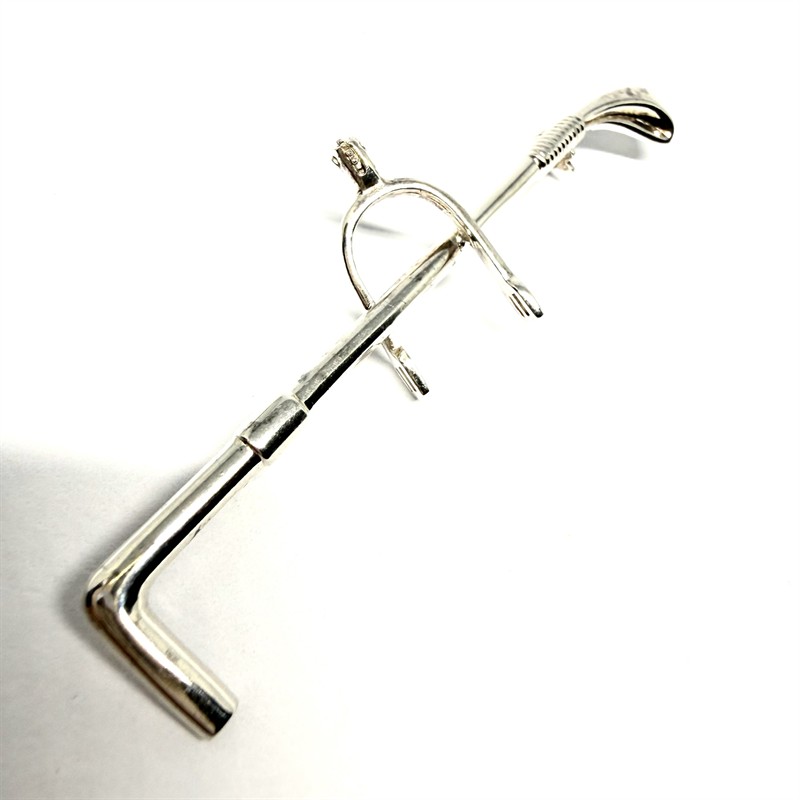 Tematická, celostříbrná brož z období první republiky nesoucí jezdecký motiv. Šperk byl vyhotoven ze stříbra ryzosti 835/1000, o celkové váze 5,14 g. Délka 7 cm. Profesionálně vyčištěno. Ryzostní, autorská a puncovní značka. Výborný stav.