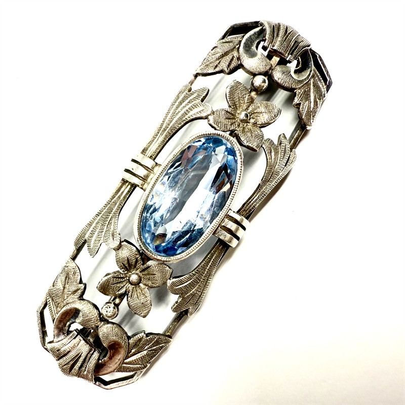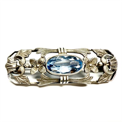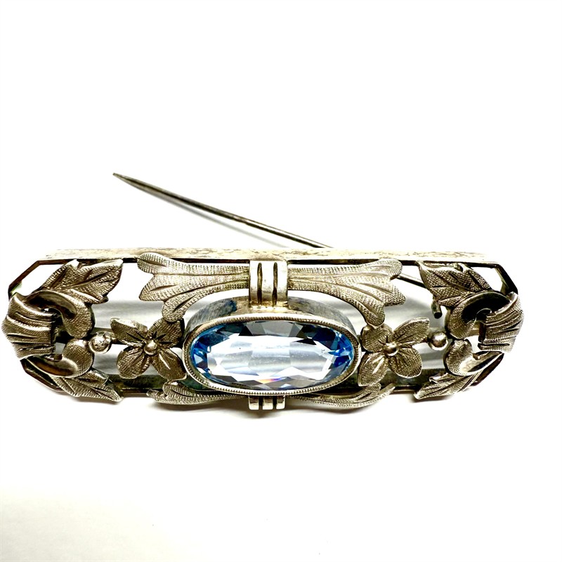 Elegantní brož zhotovená ze stříbra v první polovině 20.století. Šperk je osazen modrým spinelem fazetového brusu a zdobí jej malebný florální motiv. Stříbro ryzosti 835/1000, celková váha 8,79 g. Rozměry 5,3 x 1,5 cm. Perfektní stav.