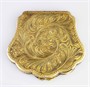 dekorativní pudřenka mušlového tvaru ze zlaceného stříbra, uvnitř zabrušované zrcátko, víčko zdobené emailovou malbou mladé ženy v historizujícím stylu, dno bohatě gravírované stylizovaných rostlinným motivem, Ag 92,67 g/800/1000, Itálie, kolem r. 1920; atest Puncovního úřadu, rozměry 8,5 x 7,5 x 1 cm; sběratelsky zajímavé