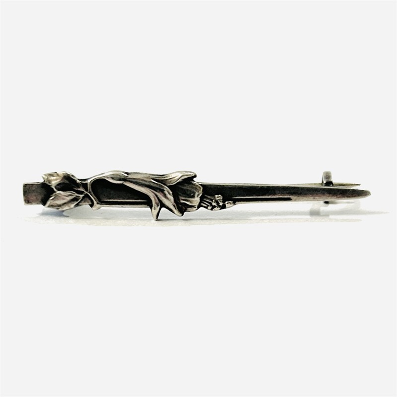 Decentní brož z období secese ve tvaru dříku částečně ovinutého květem lilie s listy. Půvabný design, kvalitní německá zlatnická práce z přelomu 19. a 20. století. Zhotoveno z nezlaceného stříbra o ryzosti 800/1000, jehla z obecného kovu; nově opatřeno puncem S-69 (zajíc 5) a ryzostní číslo se značkou výrobce zespoda. Hmotnost 2,69 g, délka 46 mm, šířka 6 mm. Zapínání na "C" sponu v pořádku. Ponecháno s přirozenou patinou, lze vyčistit, celkově ve velmi zachovalém stavu.