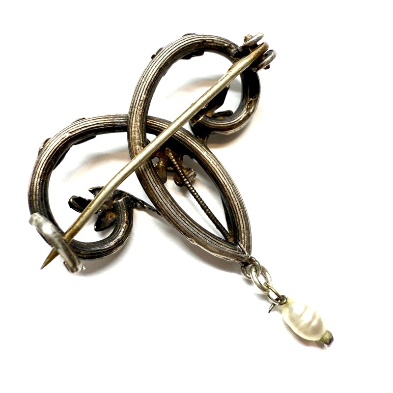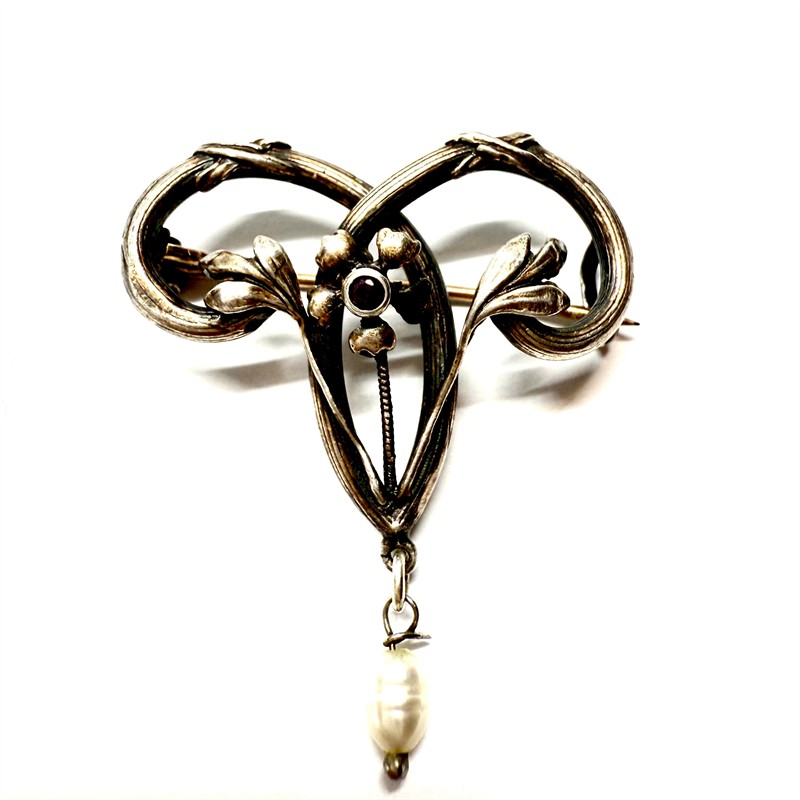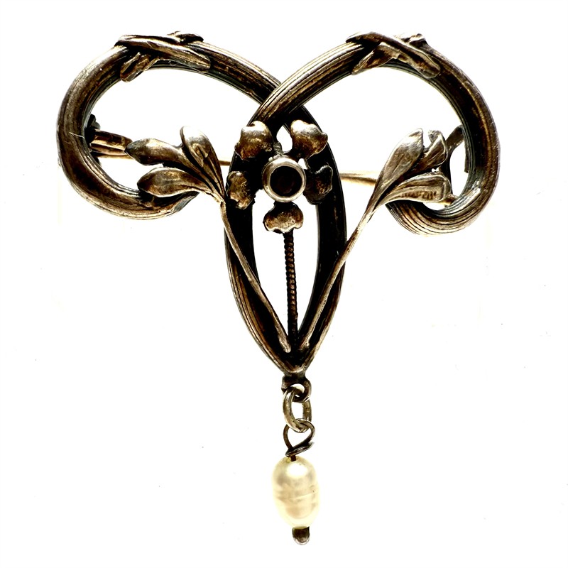Jemná, decentní stříbrná brož zhotovená počátkem 20.století v secesním stylu. Šperk zhotoven ze sterlingové stříbra (925/1000), jehla a zavěšení říční perly z obecného kovu. Celková váha 3,85 g. Rozměry cca 2,7 x 3,3 cm. Výborný stav.