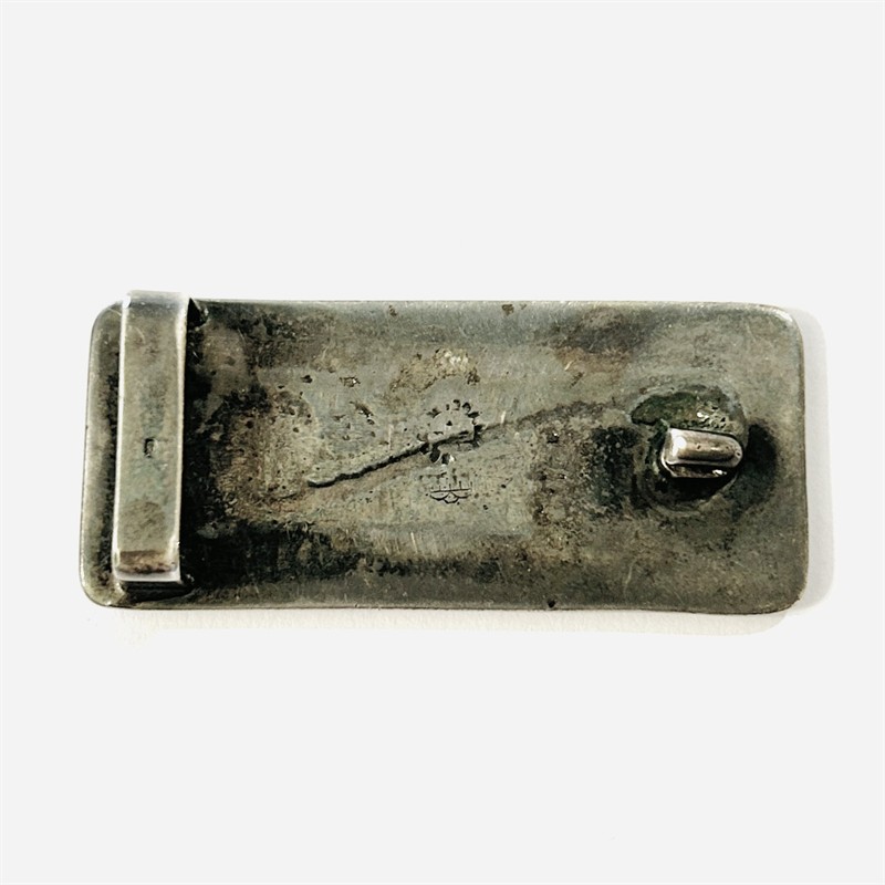 Nevšední obdélná spona na pásek s motivem volutové křivky uložené v rytém lůžku, zkosený rámeček hladký. Solidní, patrně mexická práce z 2. poloviny 20. století. Zhotoveno z nezlaceného stříbra o ryzosti 925/1000; nově opatřeno puncem S-61 (kamzík 2) na průvleku a značka výrobce zezadu. Hmotnost 20,75 g, délka 55 mm, šířka 21,5 mm, vnitřní délka průvleku 11,5 mm. Ponecháno s přirozenou patinou, lze vyčistit, celkově v zachovalém stavu.