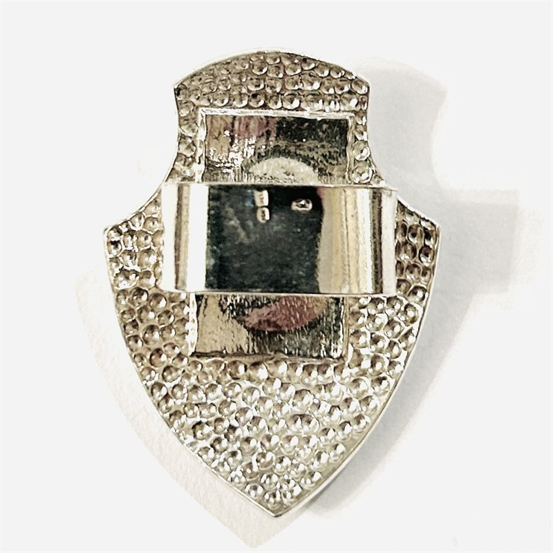 Moderní spona na šátek ve tvaru štítu, ve středu osazeno oválnou muglí přírodního hnědého jaspisu, zdobeno vinutým gravírováním připomínající cestu ze stop. Nápaditá tuzemská zlatnická práce z první pětiny 21. století. Zhotoveno z nezlaceného stříbra o ryzosti 925/1000; punc S-61 (kozlík 2), ryzostní číslo a mistrovská značka "BEN" na průvleku. Hmotnost 7,30 g, délka 33 mm, šířka 24 mm, délka průvleku 16,5 mm. V novém, tedy nenošeném stavu.