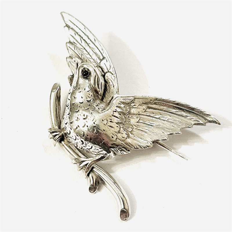 Nevšední brož s dynamický motivem vzlétajícího ptáka z větvě, plastické tělo s jemnými detaily, místo oka osazeno rubínem kulatého brusu. Dobový šperk s tradiční symbolikou, kvalitní západoevropská zlatnická práce z konce 19. století. Zhotoveno z nezlaceného stříbra, zapínací háček o ryzosti 925/1000, tělo a jehla o ryzosti 800/1000; rakousko-uherský dovozový punc S-32 (AV) s písmenem „A“ (značící vídeňský puncovní úřad) na jehle. Hmotnost 3,79 g, délka 45 mm, šířka 31 mm. Zapínání na novou „C“ sponu v pořádku, celkově v zachovalém stavu, odborně vyčištěno a vyleštěno zlatníkem.