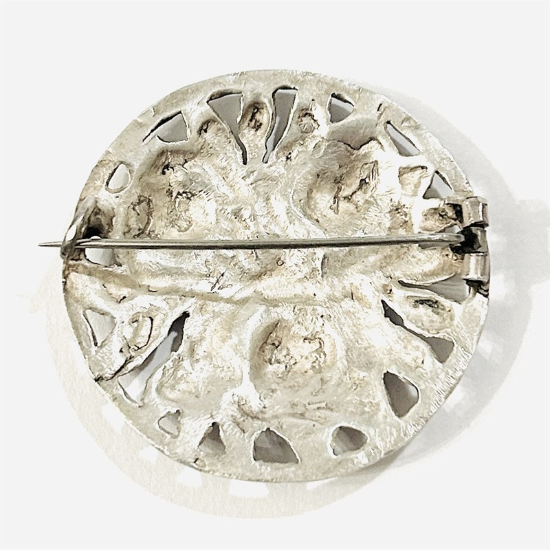 Výrazná, kulatá brož s plasticky vyvedeným motivem květů růže s listy, ozvláštněno průsvitkami. Solidní západoevropská práce z 3. čtvrtiny 20. století. Zhotoveno z nezlaceného stříbra o ryzosti 835/1000, jehla z obecného kovu; nově označeno pucem S-68 (zajíc 4) zezadu, nově označeno "MET" na jehle. Hmotnost 16,72 g, průměr 42,5 mm. Zapínání na "C" sponu v pořádku, ponecháno s jemnou přirozenou patinou, lze vyčistit, celkově ve velmi zachovalém stavu.