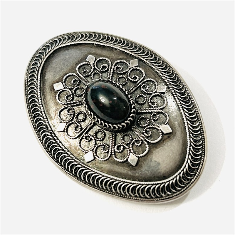 Větší, dekorativní brož osazena oválnou muglí přírodního heliotropu, zdobeno jemně filigránem a pletenci. Kvalitní mimoevropská práce z 2. třetiny 20. století. Zhotoveno z nezlaceného stříbra o ryzosti 950/1000; vyhotoveno osvědčení puncovního úřadu, ryzostní číslo zezadu, neznačeno. Hmotnost 9,81 g, délka 50 mm, šířka 35,5 mm. Zapínání na "C" sponu v pořádku, ponecháno s přirozenou patinou, lze vyčistit, celkově v zachovalém stavu.
