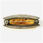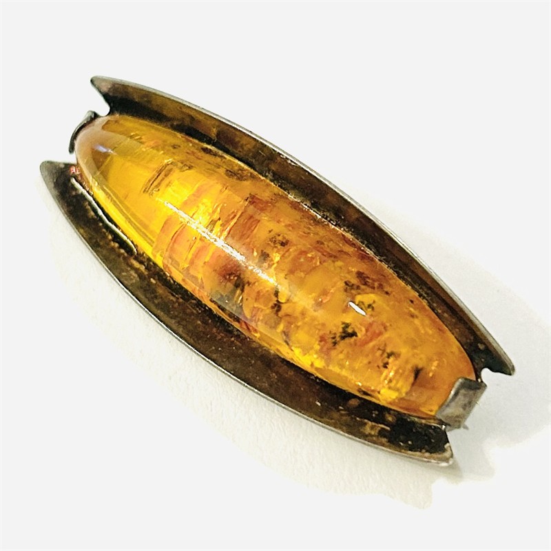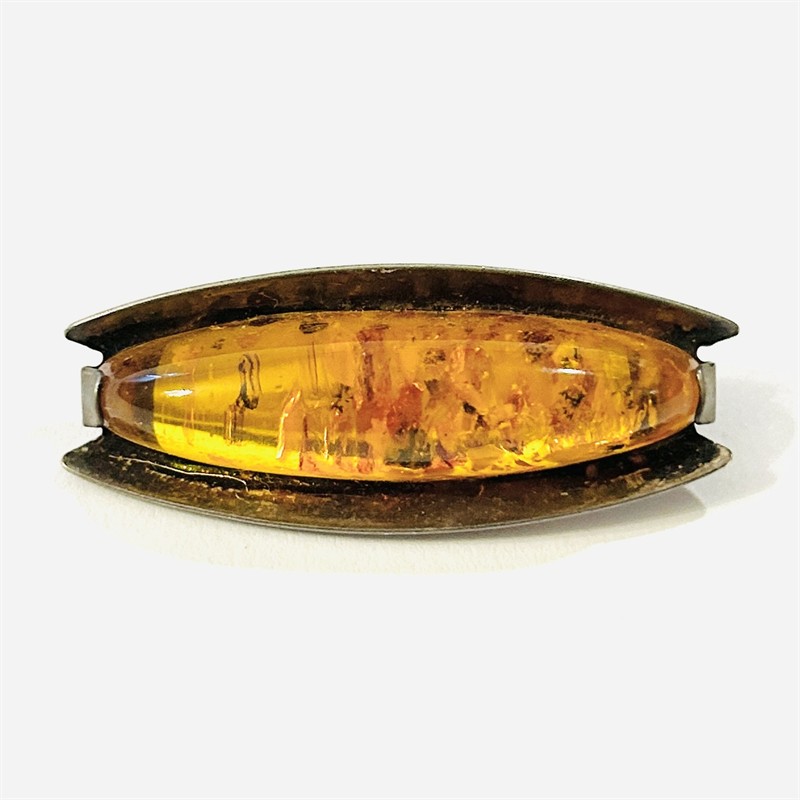 Vkusná, nadčasová brož osazená podlouhlou oválnou muglí přírodního jantaru, usazeno v efektně tvarované hlavici. Modernistický design, oblíbený vzor významného výrobce Fischland (založeno Georgem Kramerem) z 60. let 20. století. Zhotoveno z nezlaceného stříbra o ryzosti 835/1000; nově označeno pucem S-68 (zajíc 4) na jehle, ryzostní číslo a značka výrobce "ryba" zezadu. Hmotnost 5,71 g, délka 42,5 mm, šířka 17 mm. Zapínání včetně pojistky v pořádku, ponecháno s přirozenou patinou, celkově ve velmi zachovalém stavu.