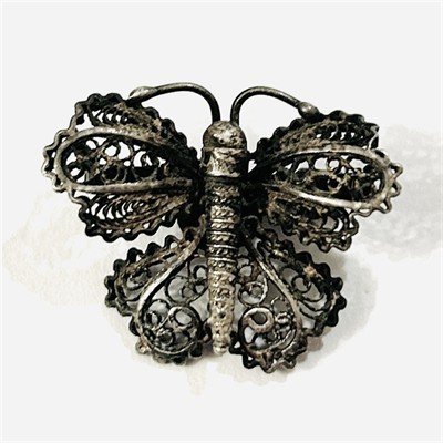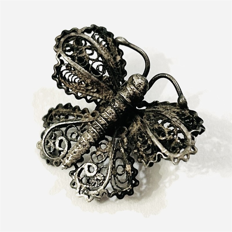 Půvabná menší brož ve tvaru motýla, vyplněno jemnými filigránovými volutami. Elegantní a hravý šperk, precizní, patrně balkánská filigránská práce z 2. třetiny 20. století. Zhotoveno z nezlaceného stříbra o ryzosti 800/1000; nově opatřeno puncem S-69 (zajíc 5). Hmotnost 2,90 g, délka 25 mm, šířka 20 mm. Zapínání v pořádku, ponecháno s přirozenou patinou, lze vyčistit, celkově ve velmi zachovalém stavu.