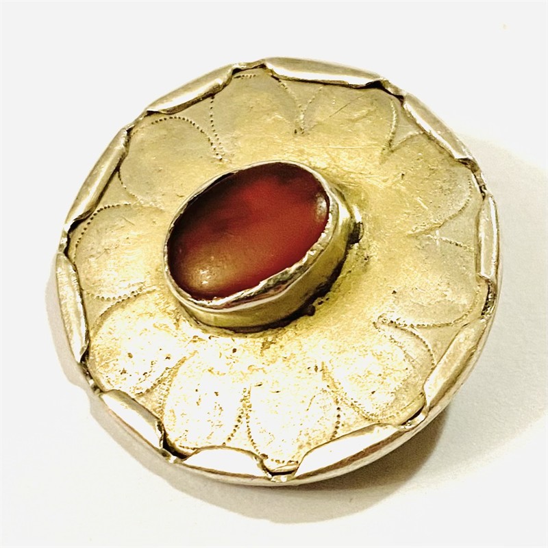 Etnická kruhová brož, jejíž frontální část je osazena vložkou s nepravidelně leštěným přírodním karneolem fasovaným v plně přiléhající obrubě, kolem zdobeno jemným puncováním. Novější solidní rámeček. Kvalitní blízkovýchodní zlatnická práce, vložka s pravděpodobnou datací do 19. století, rámeček z 2. poloviny 20. století. Sběratelsky zajímavý upomínkový šperk s nevšední konverzí. Rámeček zhotoven z nezlaceného stříbra o ryzosti 925/1000, vložka z velmi lehce zlaceného stříbra jiné ryzosti, jehla z obecného kovu; nově opatřeno puncem S-61 (kozlík 2) a ryzostní číslo zezadu, jehla nově označena "MET". Hmotnost 8,80 g, délka 29 mm, šířka 27 mm. Zapínání včetně pojistky v pořádku, ponecháno s původní patinou, celkově v zachovalém stavu.