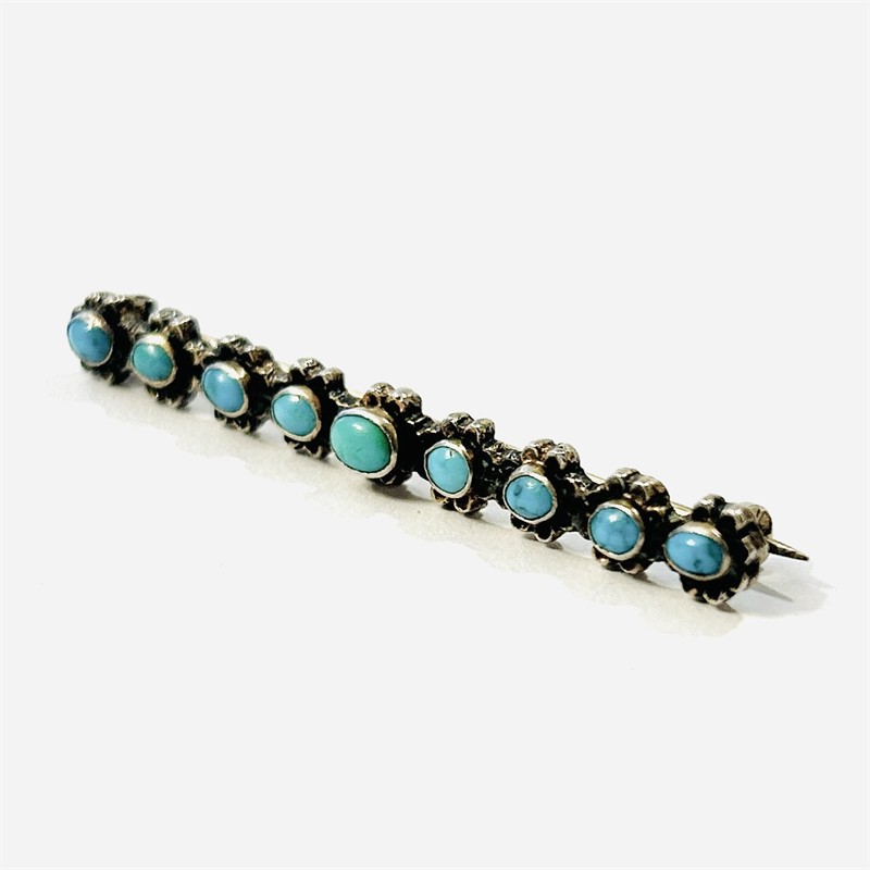 Elegantní, podlouhlá brož osazena v řadě 9 oválnými muglemi přírodního tyrkysu, prostřední lehce větší, fasováno v hladkých obrubách s květinovými rámečky, zadní strana zdobena ornamentálním rytím. Typická sedmihradská zlatnická práce z poslední třetiny 19. století. Zhotoveno z nezlaceného stříbra o ryzosti 750/1000; rakousko-uherský punc S-34 (lev 4) s písmenem "P" (značící budapešťský puncovní úřad) a ryzostní číslo na sponě a jehle. Hmotnost 3,78 g, délka 47 mm, šířka 5,5 mm. Zapínání na "C" sponu v pořádku, ponecháno s přirozenou patinou (podtrhující estetiku šperku), lze vyčistit. Zezadu a na jehle velmi lehké zbytky zlacení, celkově ve velmi zachovalém stavu. Největší rozmach sedmihradských šperků v poslední třetině 19. století, typické pro své novorenesanční, méně i novobarokní tvarosloví. Vynikají vysokou úrovní ručního zpracovaní, nejčastěji zhotovovány ve stříbře a osazeny přírodními kameny a perlami.